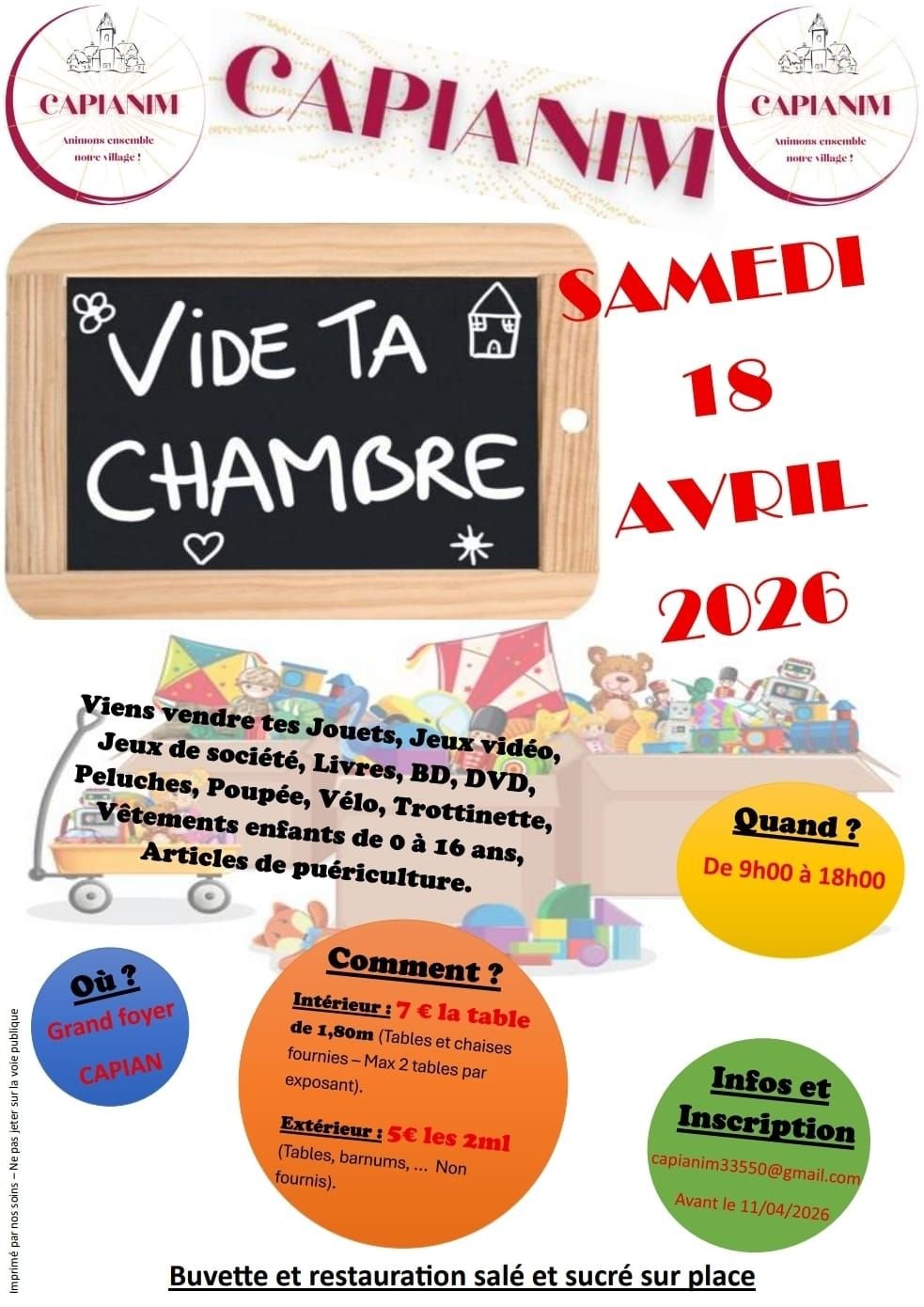 Envie de vider ta chambre ? Viens vendre tes jouets, jeux vidéos, jeux de société, livres, BD, DVD, peluches, vélos... et même tes vêtements ! (de 0 à 16 ans) !