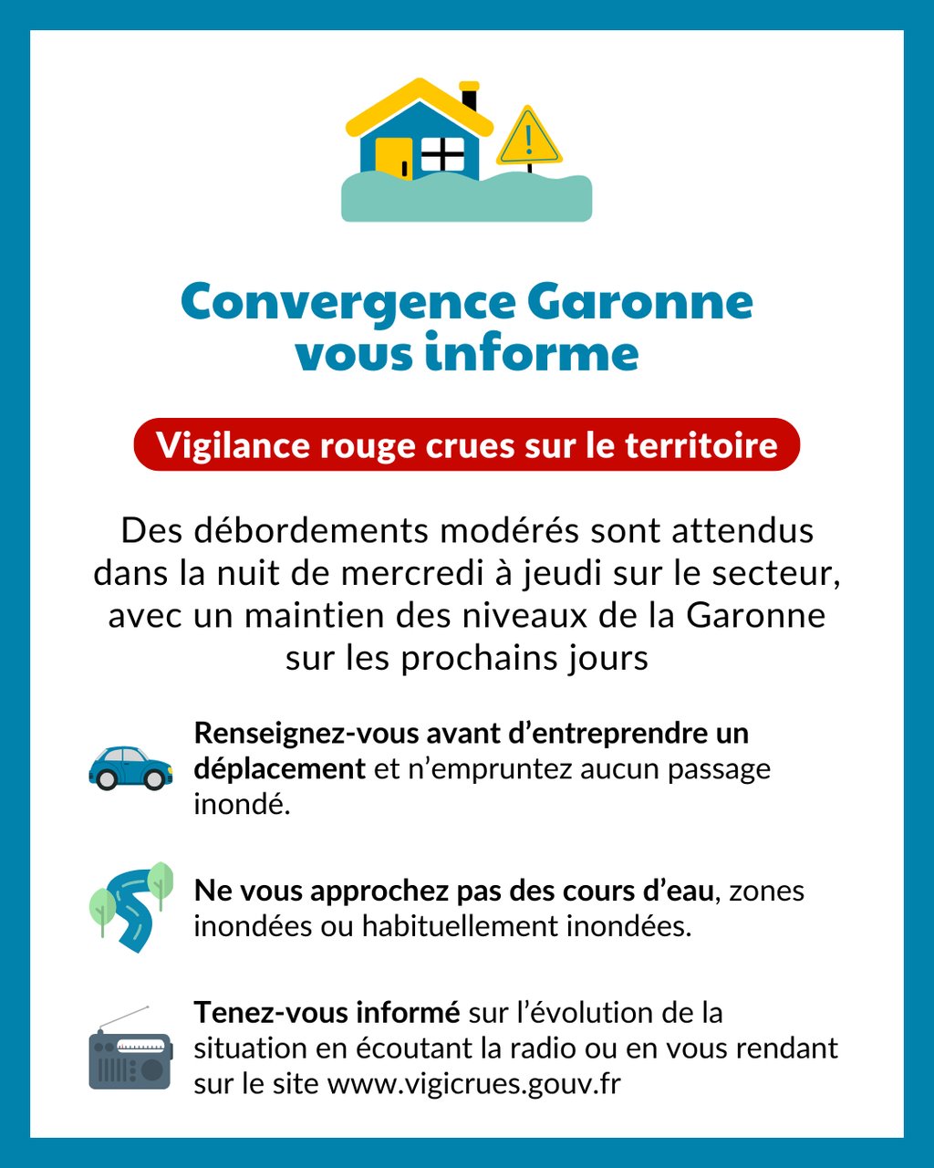 Des débordements modérés sont attendus dans la nuit de mercredi à jeudi sur le secteur, avec un maintien des niveaux de la Garonne sur les prochains jours en réponse aux précipitations actuelles qui se devraient se maintenir sur la fin de la semaine.