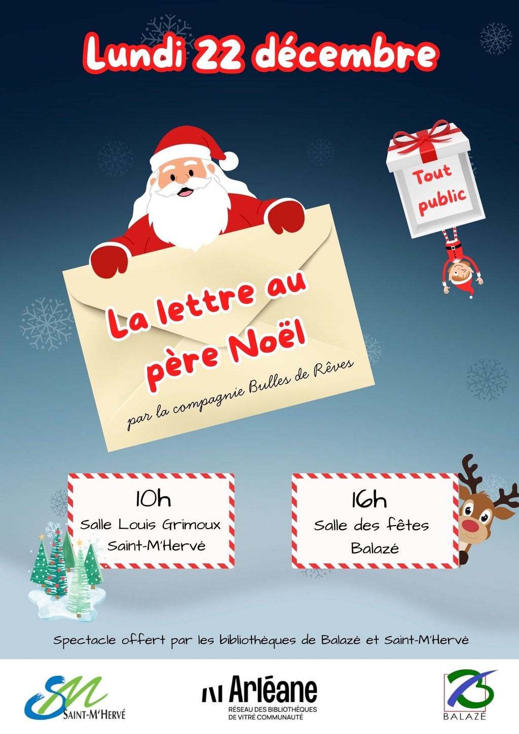 Les bibliothèques de Balazé et Saint-M'Hervé vous invitent à leur spectacle de Noël "La lettre au père noël" par la compagnie Bulles de Rêves 🎄🎅