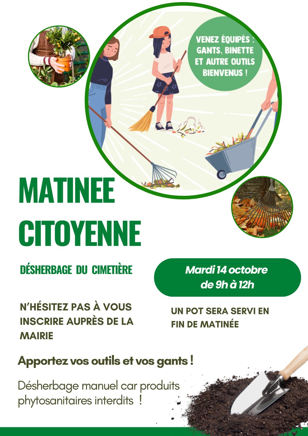 Matinées citoyennes de désherbage dans les cimetières : À l’approche de la Toussaint, des matinées citoyennes de désherbage des cimetières sont organisées par la Commune. Rendez-vous le mardi 14 octobre au cimetière du Temple. Un pot sera servi en fin de matinée aux bénévoles.