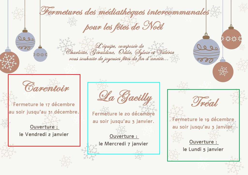 đLa mĂ©diathĂšque intercommunale de Carentoir sera fermĂ©e du 17 dĂ©cembre au 31 dĂ©cembre inclus Ă l'occasion des fĂȘtes de fin d'annĂ©e.