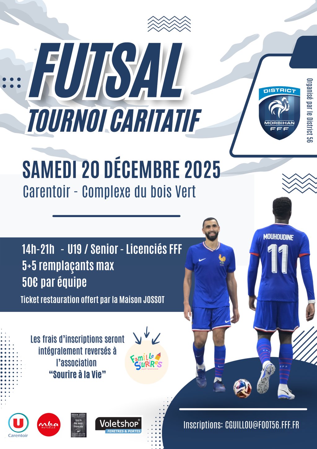 Samedi 20 décembre, au complexe sportif du Bois-Vert (salle des sports de Carentoir), le District de Football du Morbihan et l'association "un sourire à la vie" organisent une journée caritative de "FUTSAL"
