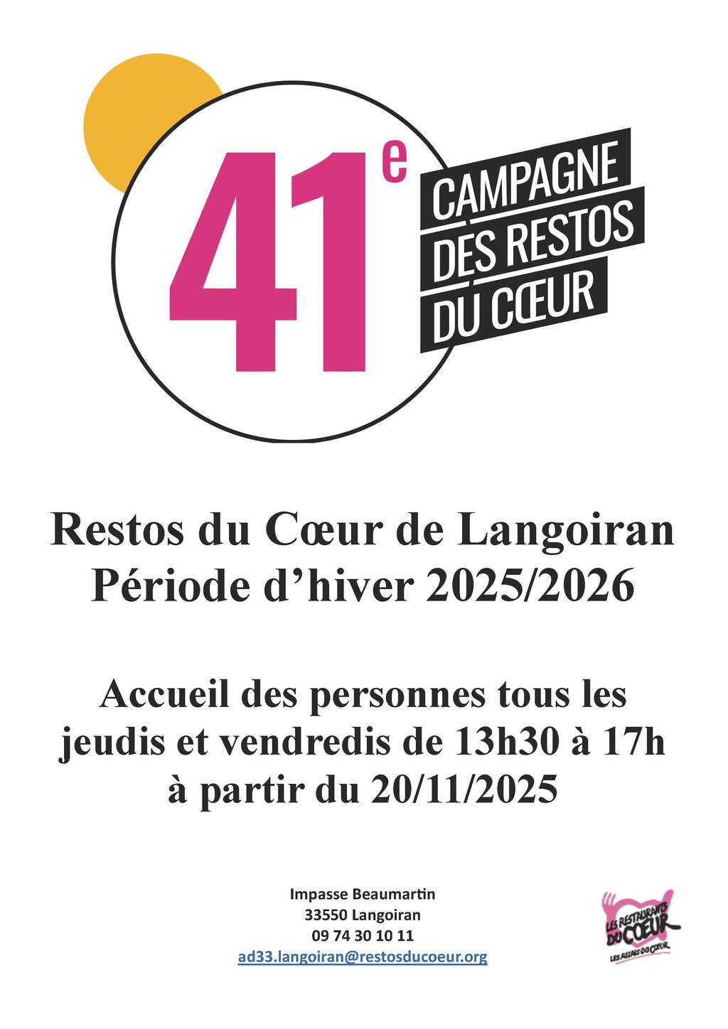 🙏 Les restos du Cœur de Langoiran vous accueillent tous les jeudis et vendredis de 13h30 à 17h à partir du 20 novembre 2025