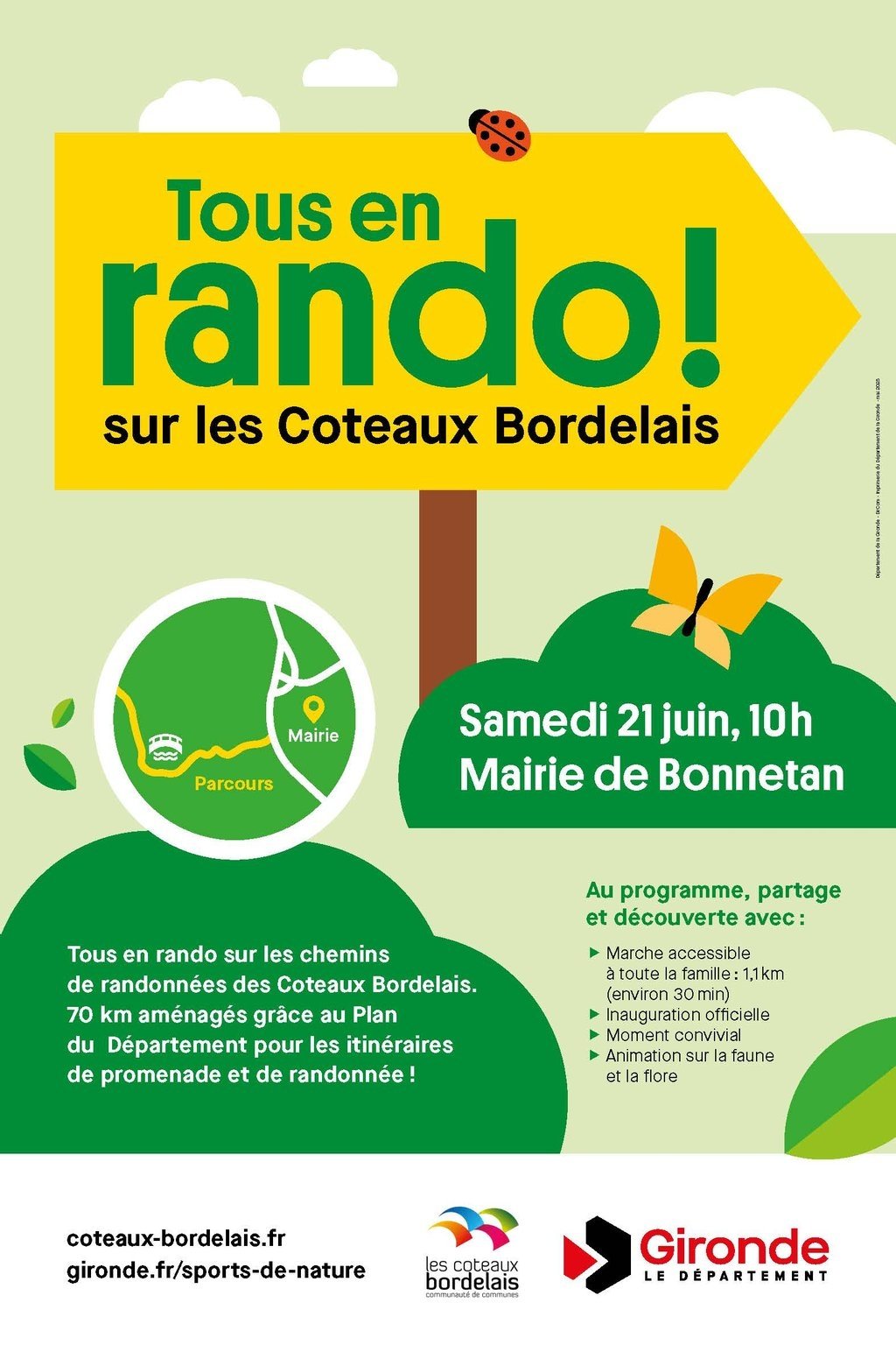 Depuis 2023, la Communauté de Communes les Coteaux Bordelais aménage et balise les chemins de randonnées dans le cadre du PDIPR (Plan Départemental des Itinéraires de Promenade et de Randonnée). Il est temps de les inaugurer ! Petits et grands, venez profiter d’un temps de marche pour découvrir le chemin de Bonnetan le samedi 21 juin à 10h. Rendez-vous à la mairie pour une balade accessible à tous : 1,1 km aller-retour pour environ 30 minutes de découverte. Après la marche, profitez d’un moment convivial et d’une animation nature sur la faune et la flore, proposée par le pôle environnement de l’UFCV.