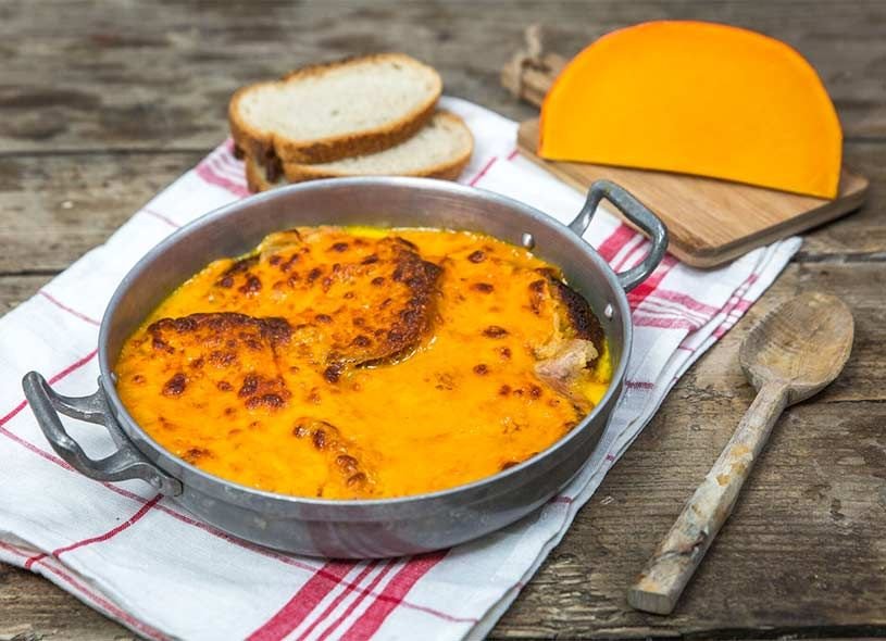 Ce fut le cas d’une garnison galloise installée sur le Boulemberg (Mont Lambert), dominant la cité. Leurs besaces ne contenaient plus que quelques restes de fromage de vache du Somerset, provenant de la ville de Cheddar, et de pain rassis. Ils eurent l’idée de faire fondre ce fromage jaune pâle en le mélangeant à un peu de bière et de le faire couler sur un peu de pain.