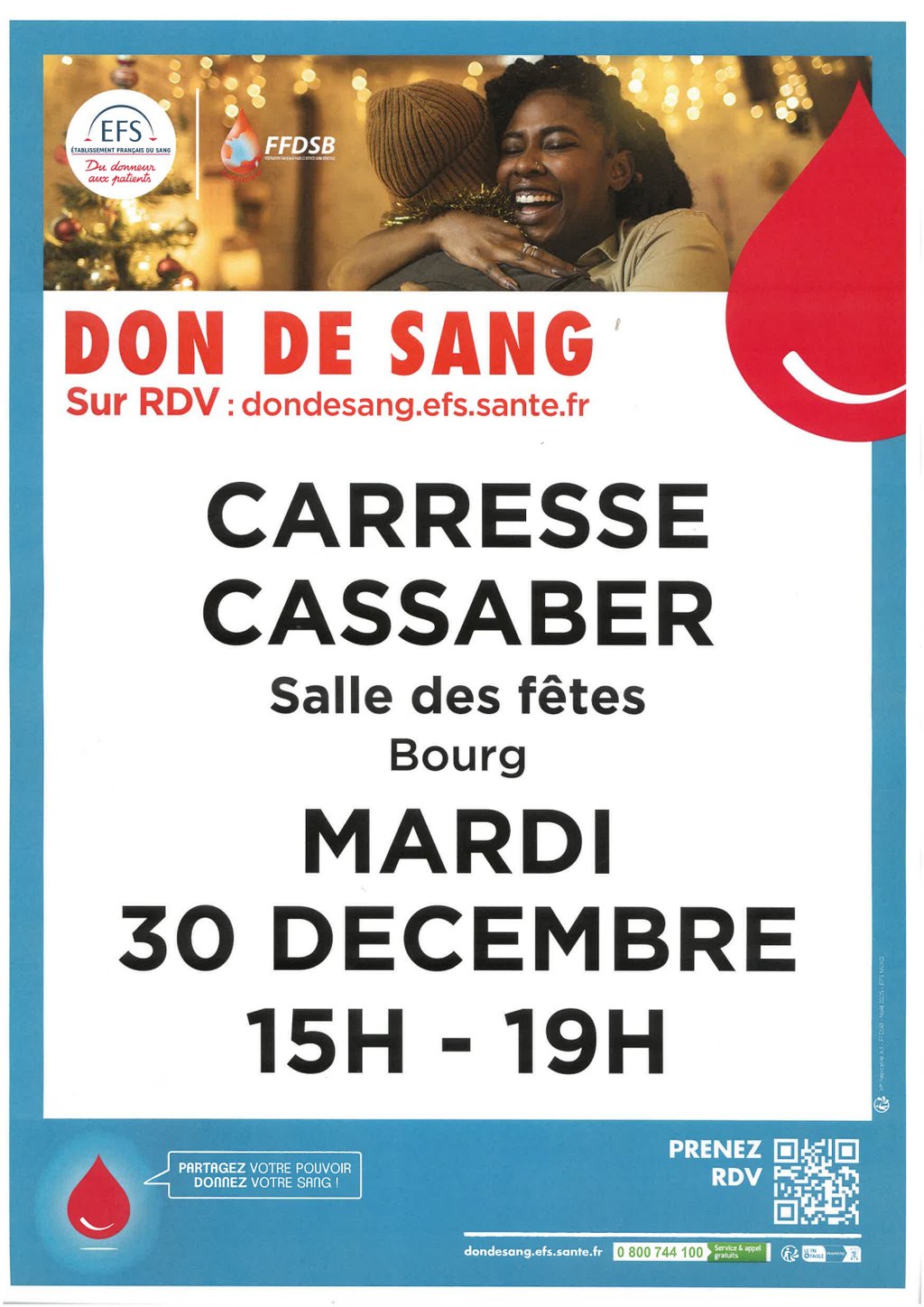 Don du sang le mardi 30 décembre 2025 de 15 h à 19 h à la salle des fêtes.