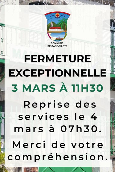 La mairie de Case-Pilote sera fermée ce mardi 3 mars 2026.