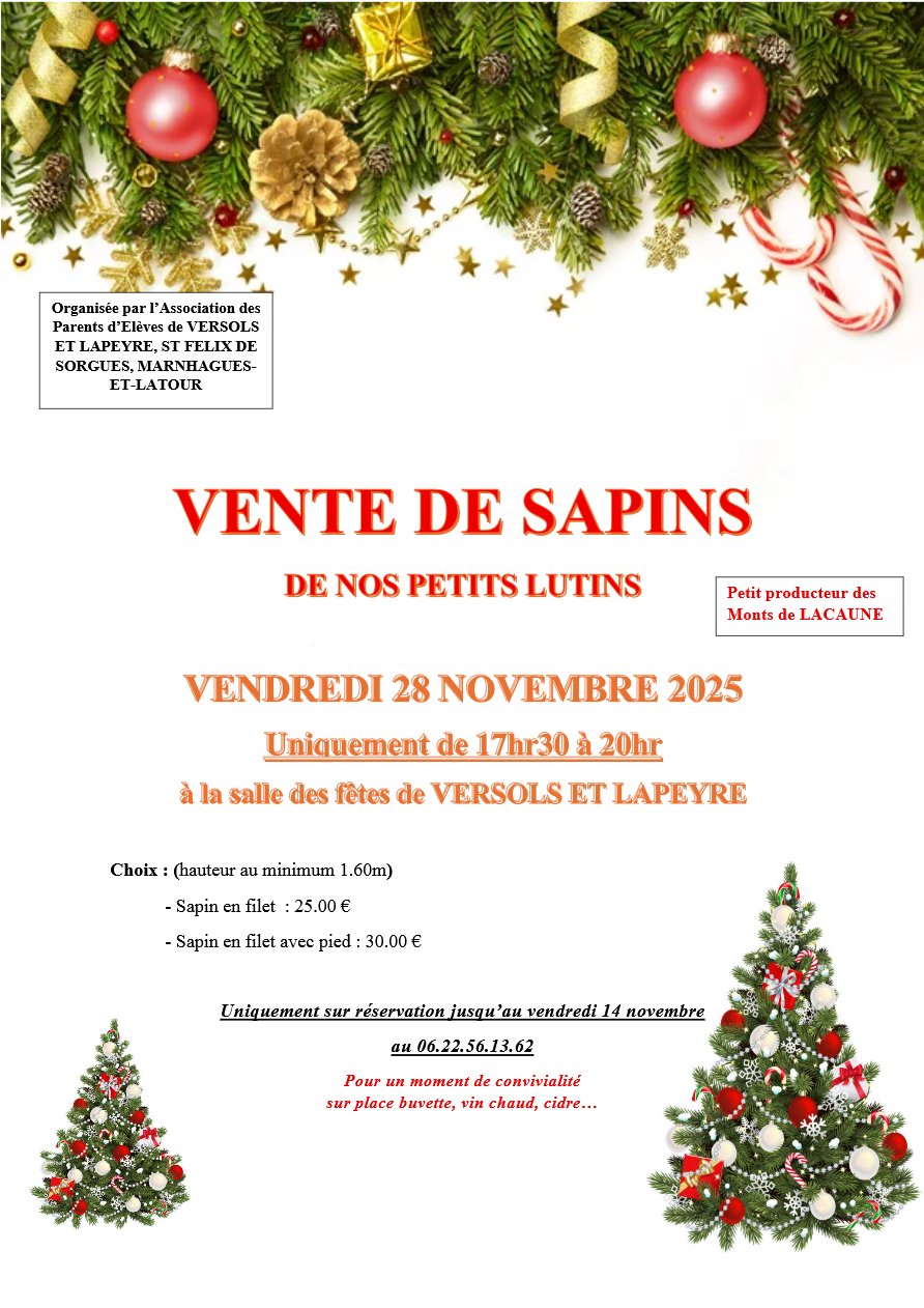 L'APE vous propose une vente de sapins de Noël le 28 novembre de 17h30 à 20 h à la salle des fêtes de Versols et Lapeyre.