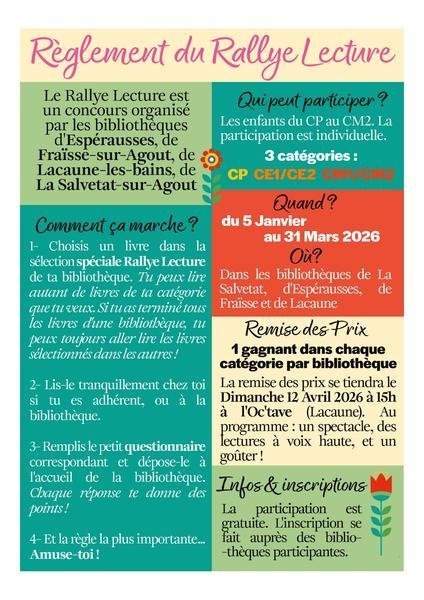 Le rallye lecture est un concours organisé par quatre bibliothèques du Territoire (La Salvetat, Fraïsse, Espérausses et Lacaune).
