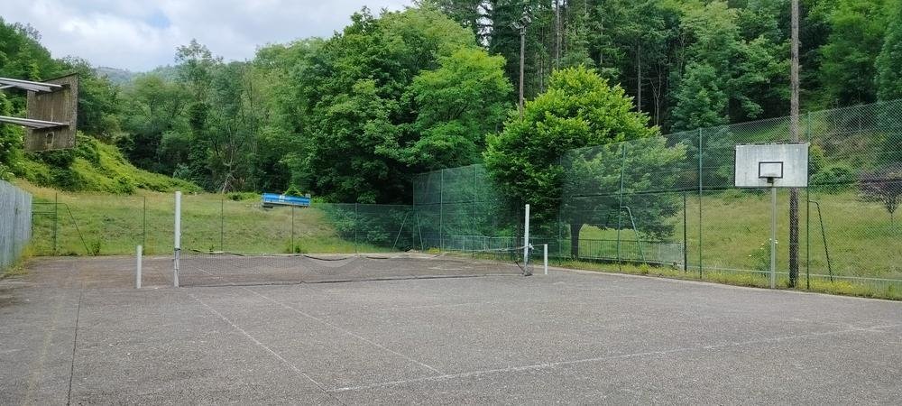 Aire située de part et d'autre d'un boulodrome et d'un terrain de sport et munie de WC, barbecue et point d'eau.