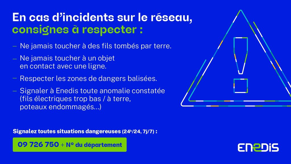 - Signaler à Enedis toute anomalie constatée (fils électriques trop bas ou à terre, poteaux endommagés, etc.)