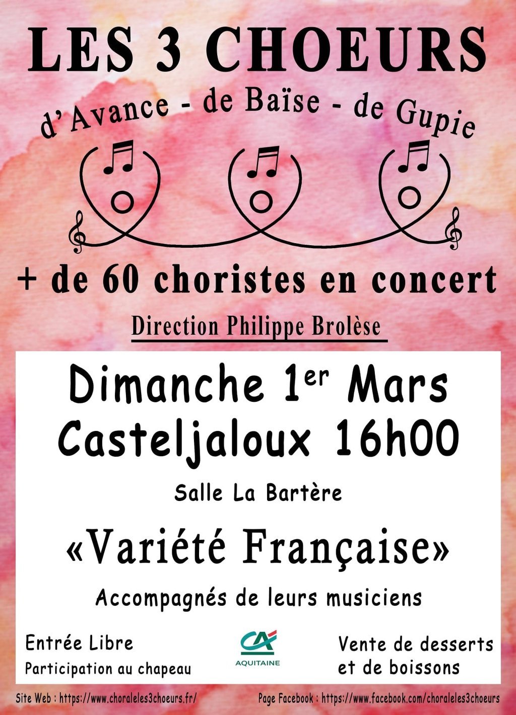 Concert "Variété française" avec les 3 chœurs d'Avance - de Baïse - de Gupie et + 60 choristes, accompagnés de leurs musiciens.