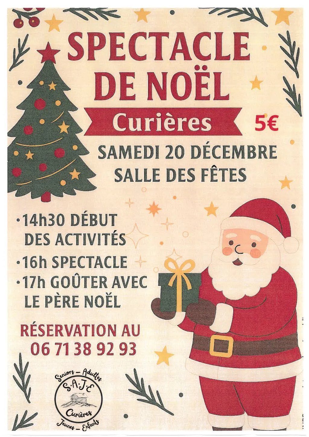 14h30 début des activités, 16h spectacle, 17h goûter avec le père noël.
