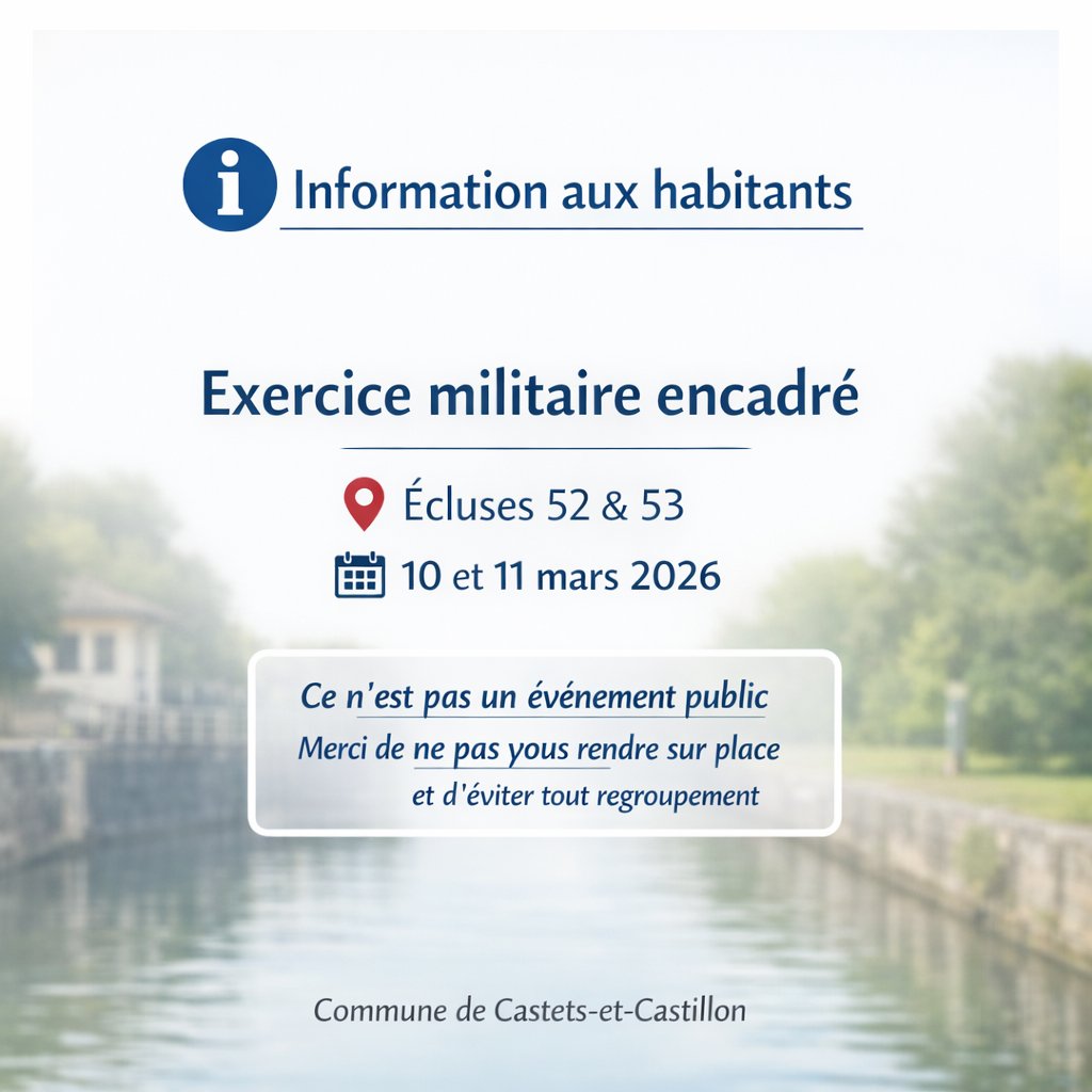 Un exercice militaire encadré aura lieu les 10 et 11 mars 2026 à proximité des écluses 52 et 53.