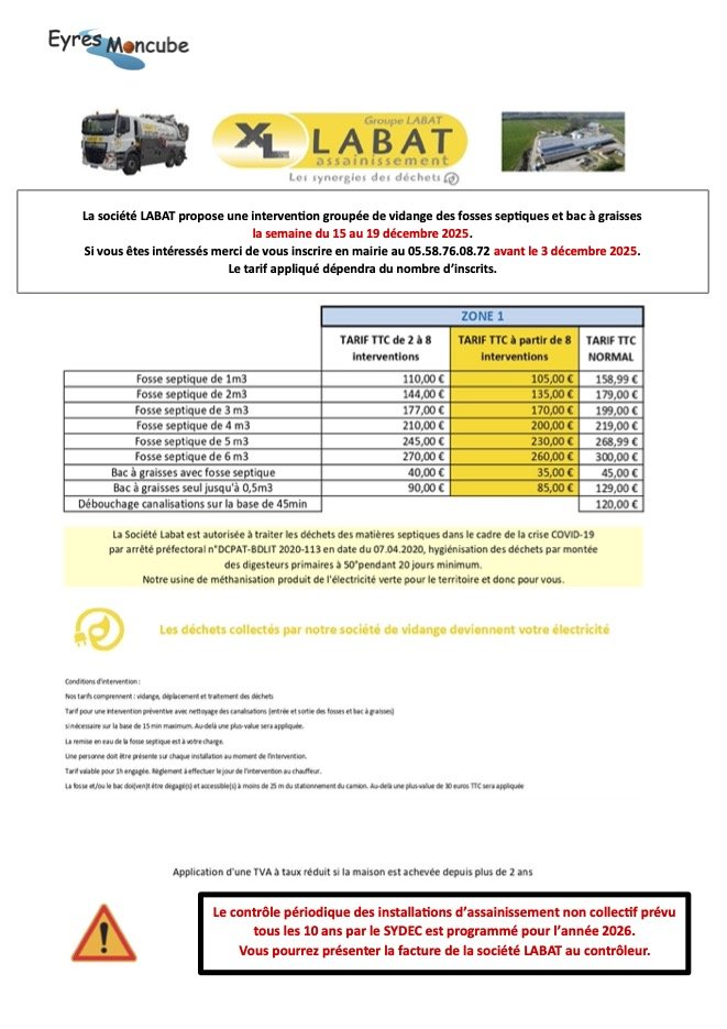 La société LABAT propose une intervention groupée de vidange des fosses septiques et des bacs à graisses du 15 au 19 décembre 2025.