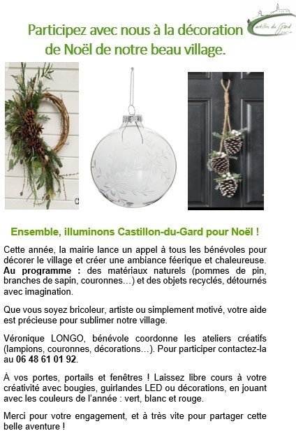 Cette année, la mairie lance un appel à tous les bénévoles pour décorer le village et créer une ambiance féerique et chaleureuse. Au programme : des matériaux naturels (pommes de pin, branches de sapin, couronnes…) et des objets recyclés, détournés avec imagination.