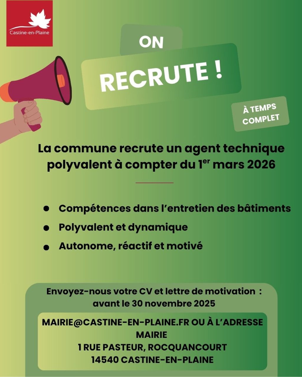 La mairie recrute un agent technique polyvalent à compter du 1er mars !