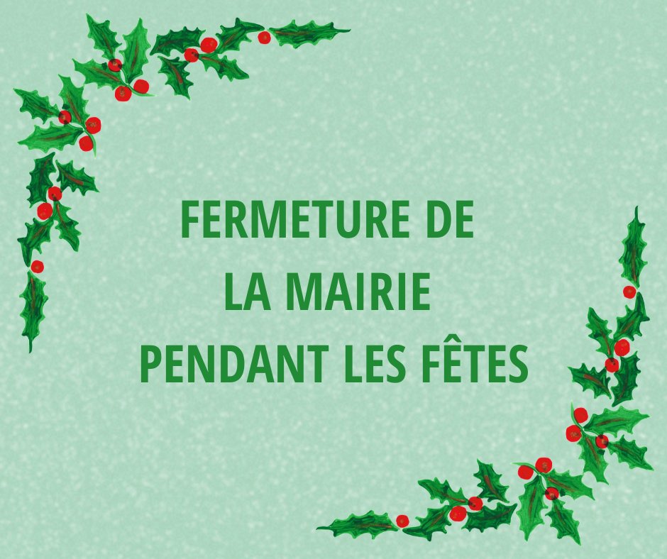 La mairie sera fermée : mercredi 24 décembre et vendredi 26 décembre 2025 puis mercredi 31 décembre 2025 et vendredi 2 janvier 2026.