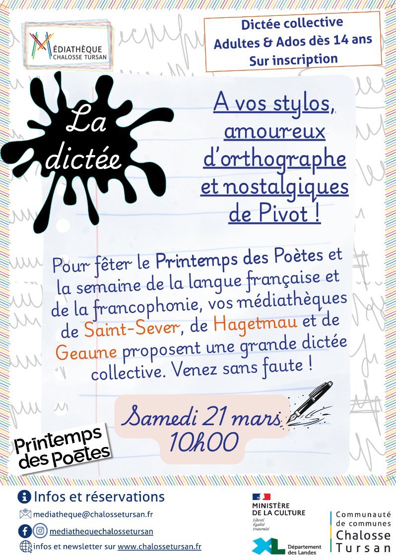 Pour fêter à la fois le Printemps des poètes et la Semaine de la langue française, vos médiathèques de Hagetmau, Saint-Sever et Geaune proposent une grande dictée collective. Venez sans faute dans une de vos médiathèques.