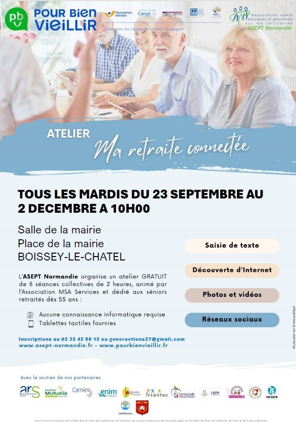 Profitez de cet atelier réservé au + de 55 ans : rendez-vous tous les mardis du 23 septembre au 2 décembre 2025 à 10h à la mairie de Boissey-le-Châtel.