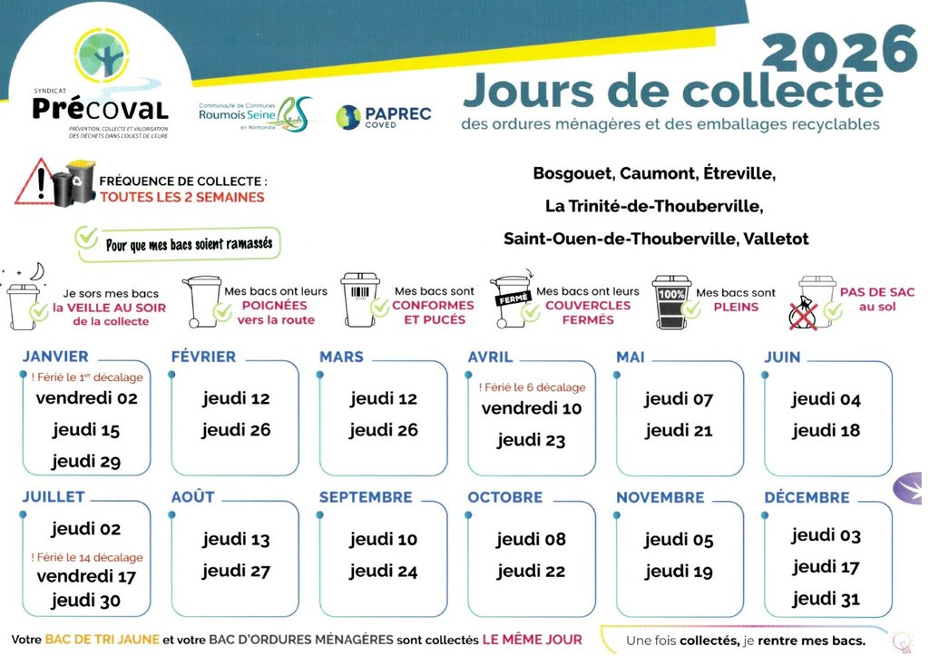 NOUVEAUTÉ 2026 : la commune ne distribue plus les bacs. En cas de demande de changement de taille ou en cas de casse ou vol, désormais, il faudra contacter Precoval au 02 32 43 14 75.