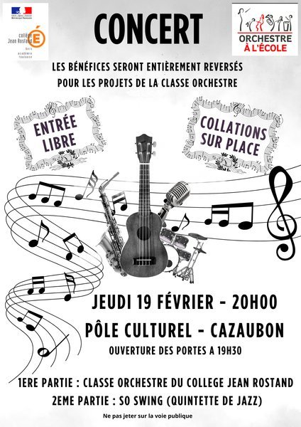 Les bénéfices de cette soirée seront entièrement reversés aux projets de la classe orchestre, afin de soutenir la pratique musicale des élèves et de favoriser l’accès à la culture pour tous.