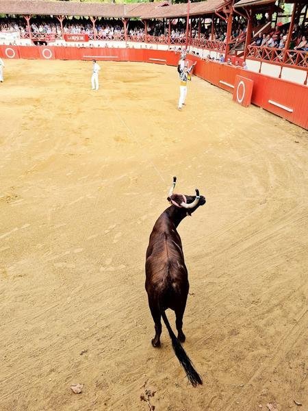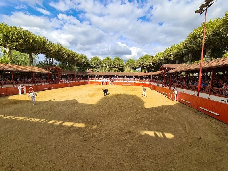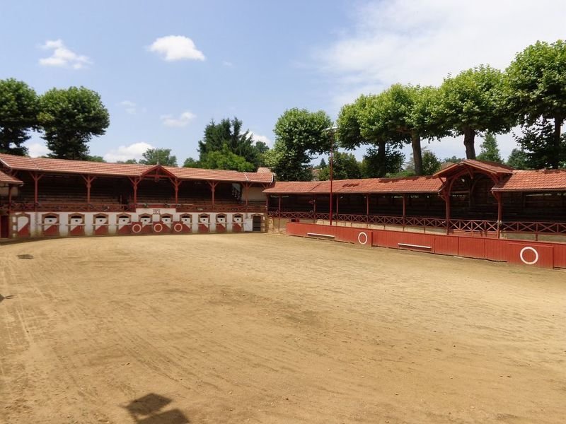 La charpente en bois est peinte en rouge "sang de boeuf". Intérêt ethnologique de ce témoin de la pratique tauromachique de cette région.