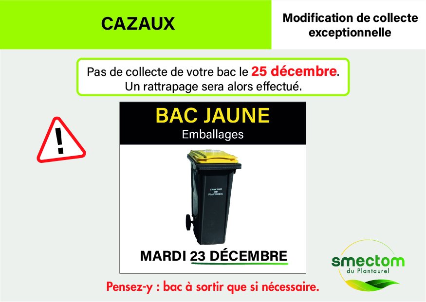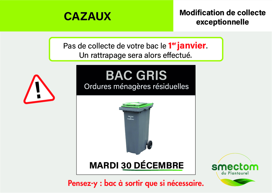 En raison des jours fériés, les collectes des bacs individuels n'auront pas lieu les jeudis 25 décembre et 1 janvier. Des jours de rattrapages seront exceptionnellement mis en place. Nous rappelons que les bacs sont à sortir la veille de la collecte.