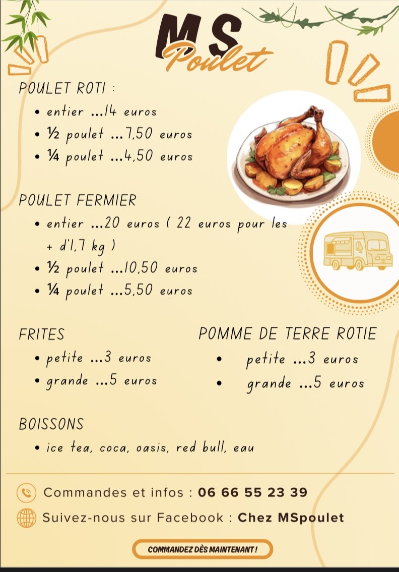 Nouveau ! Retrouvez le food truck "M&S Poulet" le jeudi soir à Cépie (18h30-21h30 à côté du boulodrome).