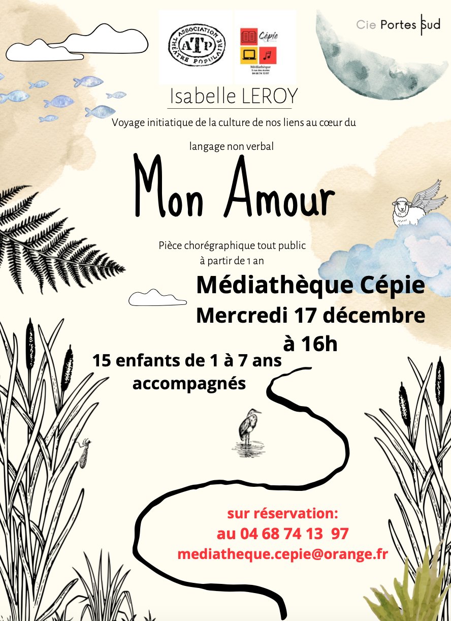 Mercredi 17 décembre à 16h spectacle dansé "Mon Amour" (enfant de 1 à 7 ans) à la médiathèque, en collaboration avec l'ATP de l'Aude.