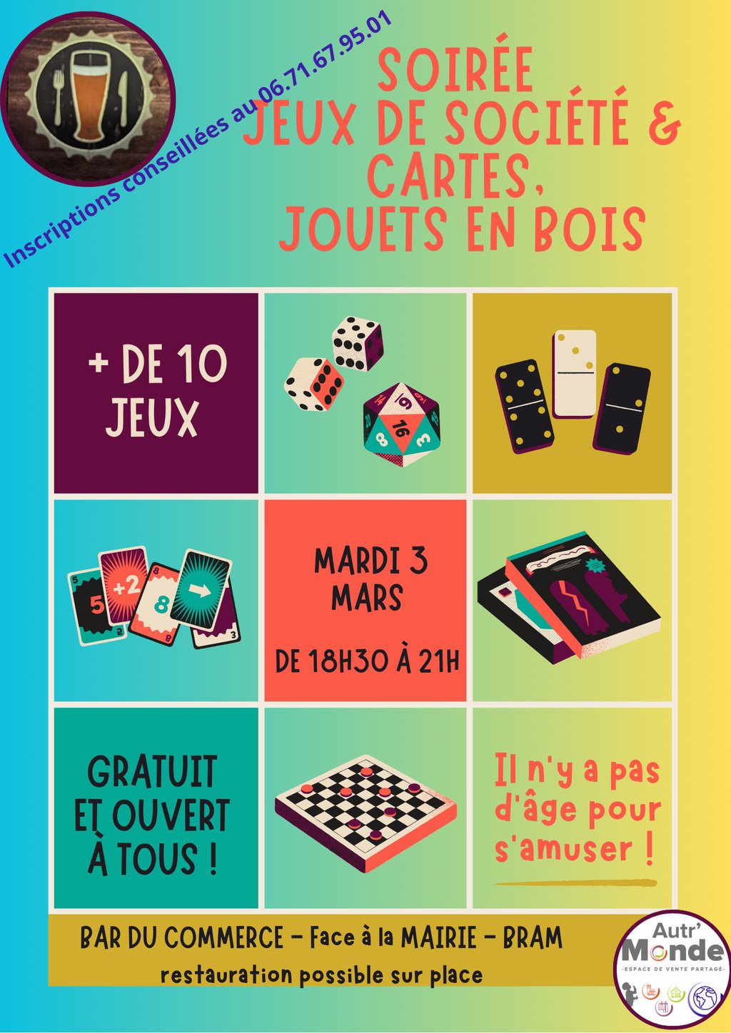 PrĂ©parez-vous pour une soirĂ©e inoubliable placĂ©e sous le signe de la convivialitĂ© et du divertissement ! Rejoignez-nous pour une SoirĂ©e Jeux de SociĂ©té oĂč rires et stratĂ©gies seront au rendez-vous, tout en savourant un dĂ©licieux repas concoctĂ© par notre talentueux chef ClĂ©ment.