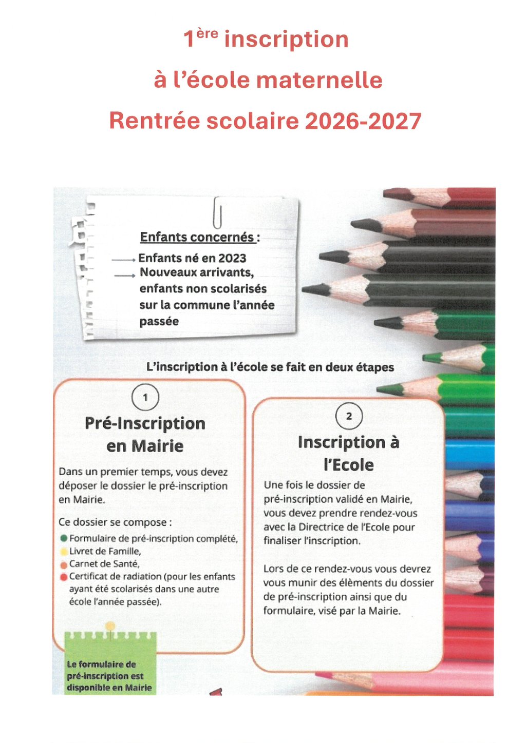 1ère inscription à l’école maternelle Rentrée scolaire 2026-2027