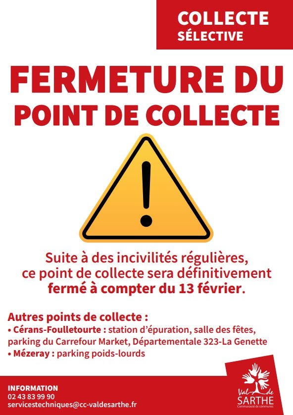 Suite à de nombreuses incivilités, le point de collecte situé Route de Mézeray à Cé- rans-Foulletourte, sera fermé définitivement à compter du 13 février. Le point de collecte situé Route de Mézeray à Cérans-Foulletourte sera retiré entre le 11 et le 13 février. Cette décision fait suite aux nombreuses incivilités constatées sur le site, telles que des dépôts sauvages et illégaux. Ces dépôts génèrent des difficultés d’accès pour le collecteur et allongent les temps d’intervention des agents techniques. Ces dysfonctionnements, liés au non-respect des consignes de tri et à un manque d’hygiène, favorisent également l’apparition de nuisibles. Le respect des règles de tri est essentiel pour garantir un service de qualité, préserver la salubrité des espaces publics et assurer la sécurité à la fois des agents et des habitants. Déplacement des PAV Les points d’apports volontaires seront préalablement nettoyés et vidés, puis regroupés sur 2 sites de collecte déjà existants sur la Commune de Cérans-Foulletourte : la salle polyvalente (rue du Maréchal Leclerc) et le parking du supermarché Carrefour Market (au croisement de la rue du Montaleaume et de la rue Anaïs Loriot). Cette réorganisation vise à consolider les PAV existants pour pallier la fermeture de point de collecte sur la Route de Mézeray. Elle permet ainsi d’optimiser le service et de préserver le cadre de vie des habitants.