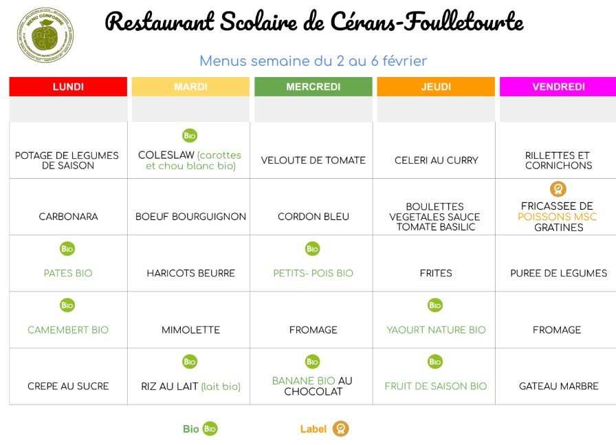 Menu restaurant scolaire du 2 au 6 février