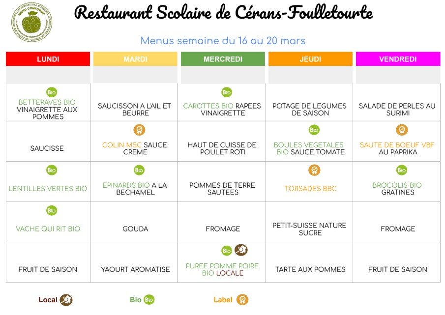 Restaurant scolaire Menus semaine du 16 au 20 mars