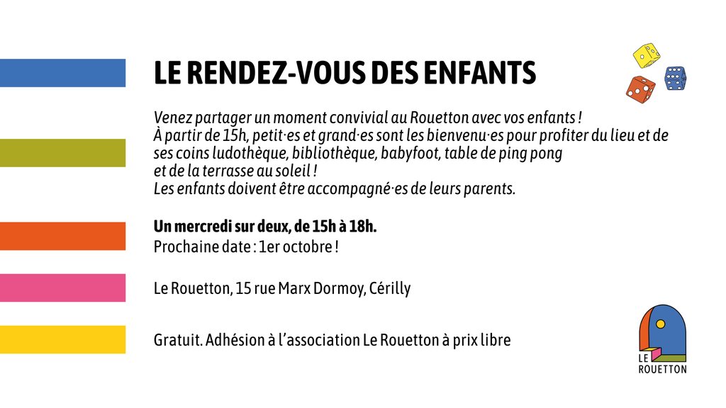 Les enfants doivent obligatoirement être accompagné·es de leurs parents. N'hésitez pas à apporter vos goûters !