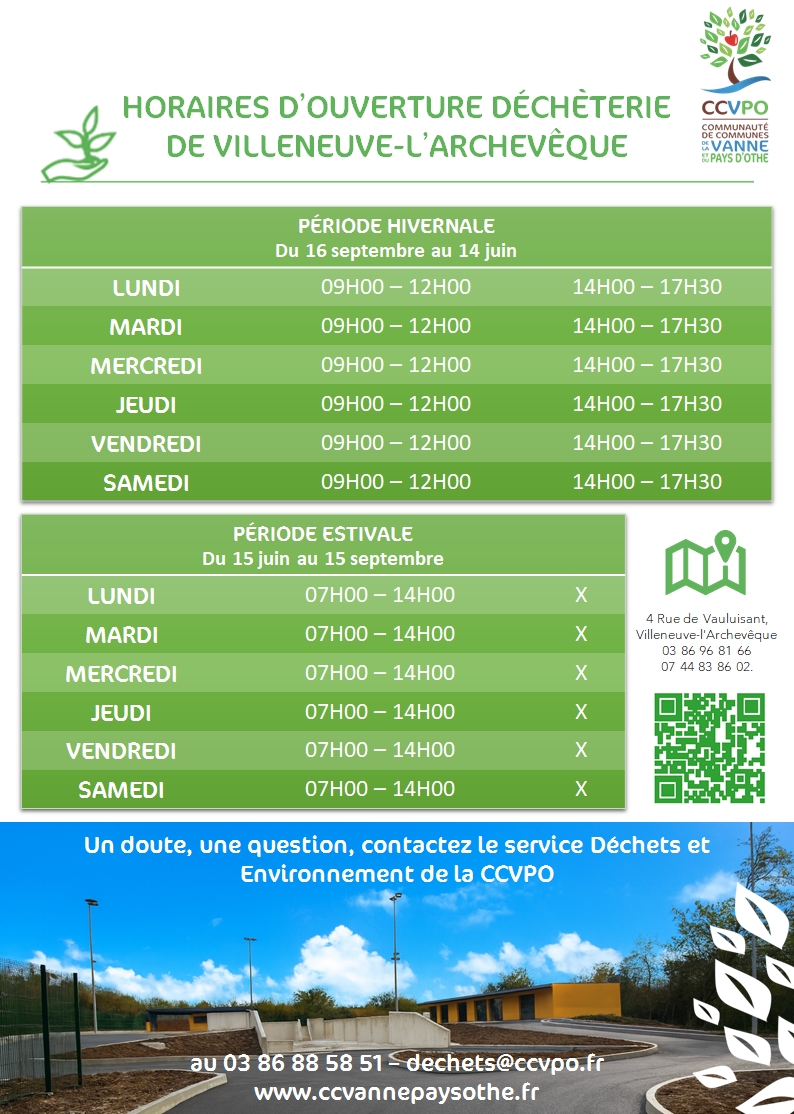 La déchèterie de Villeneuve-l’Archevêque est ouverte au public du lundi au samedi.