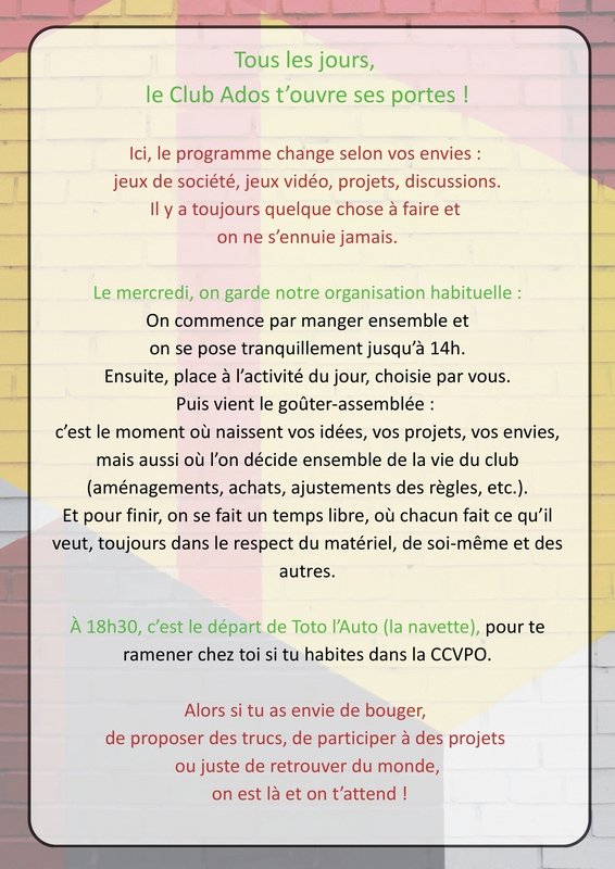 Le Club Ados rouvre ses portes en février et accueille les jeunes pendant les vacances d’hiver, du lundi 9 au vendredi 13 février 2026.