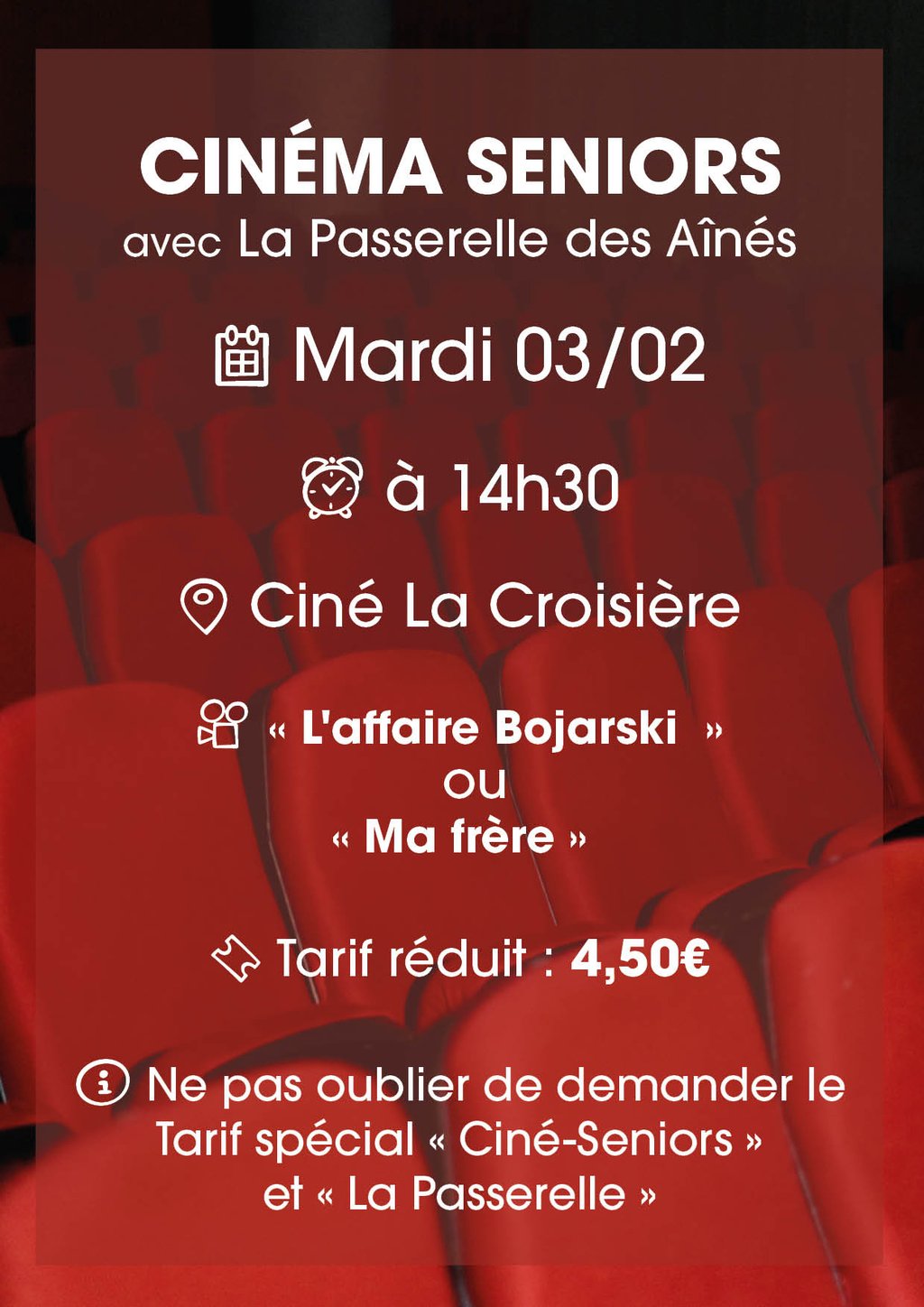 Ne pas oublier de demander le Tarif spécial « Ciné-Seniors » et « La Passerelle ».