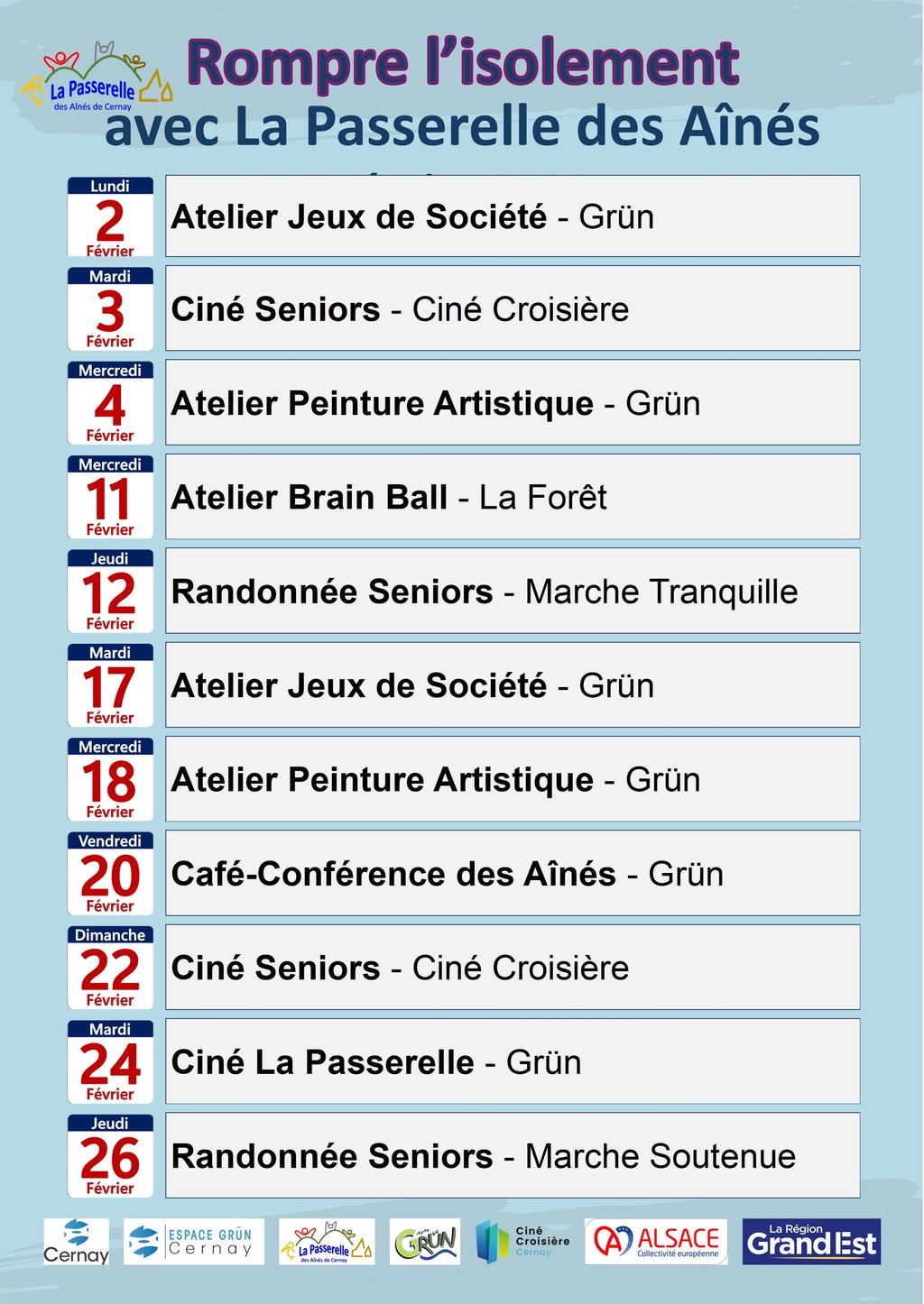 Tout le programme des activités séniors organisé par La Passerelle des Aînés de Cernay pour le mois de février.