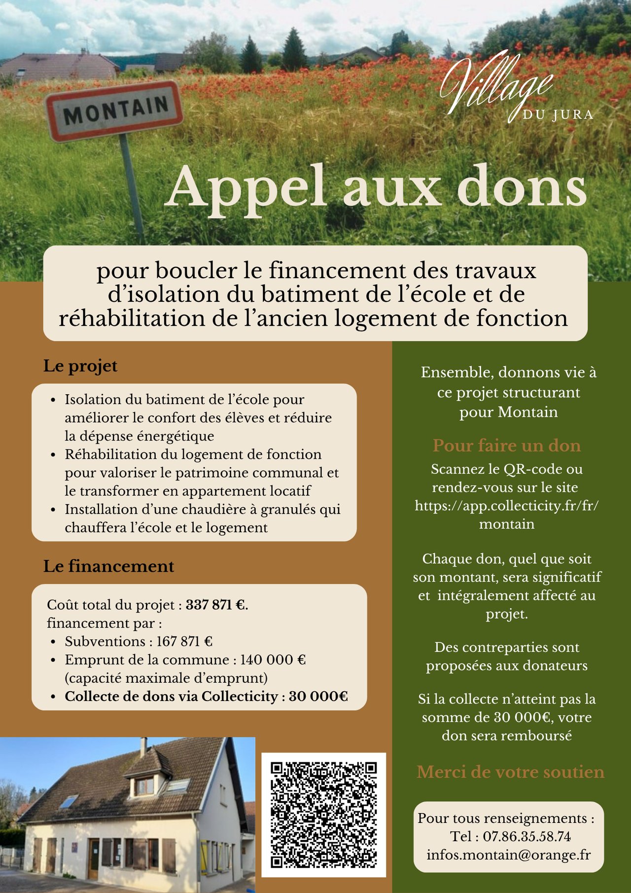 "Montain a besoin de vous ! Ensemble, finalisons la rénovation de notre école et logement communal 🏫💚"