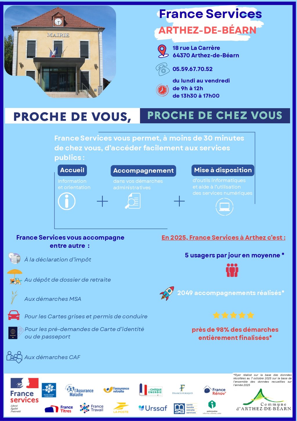 L'espace France services vous accueille à la mairie d'Arthez de Béarn. Afin d’organiser au mieux le service et l’accompagnement de l’usager, il est demandé de prendre un rendez-vous préalable auprès de la mairie d’Arthez-de-Béarn, en composant le 05.59.67.70.52.
