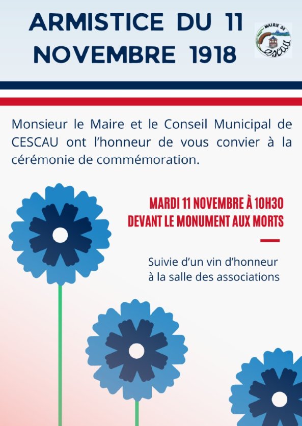 La cérémonie commémorative de l'Armistice du 11 novembre 1918 aura lieu le mardi 11 novembre à 10h30 devant le monument aux morts.