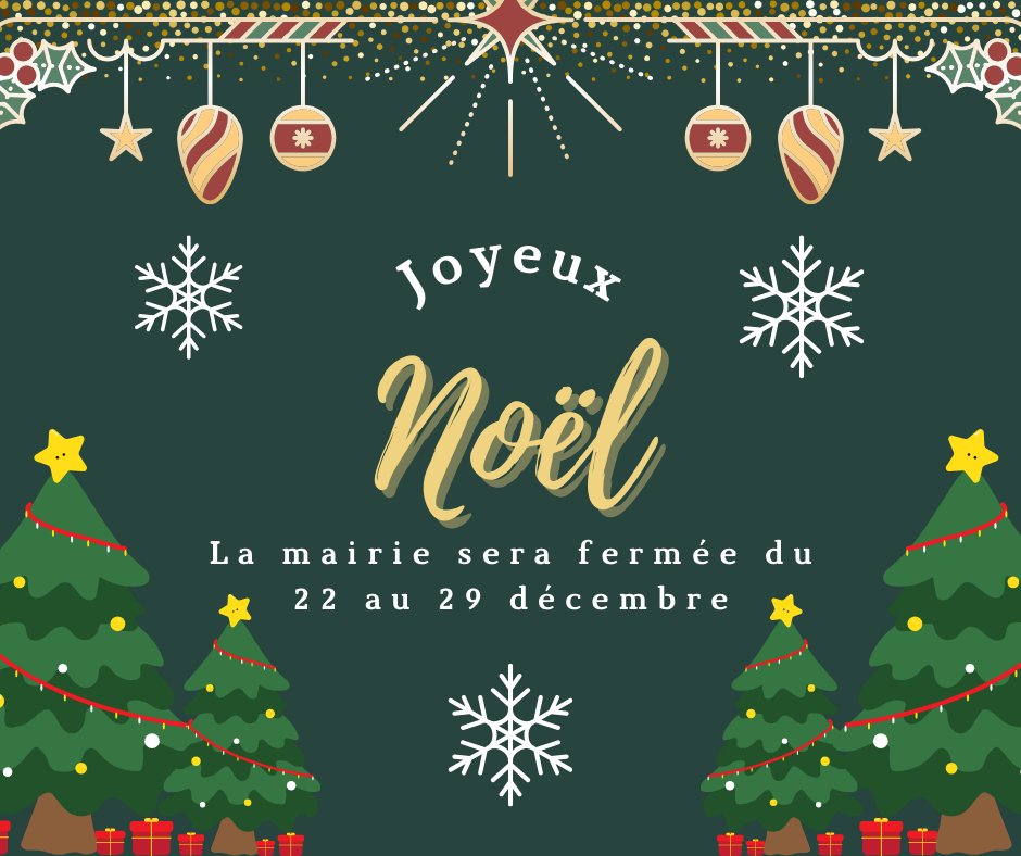 La mairie sera fermée du 22 au 29 décembre 2025. Réouverture aux horaires habituels le mardi 30 décembre.