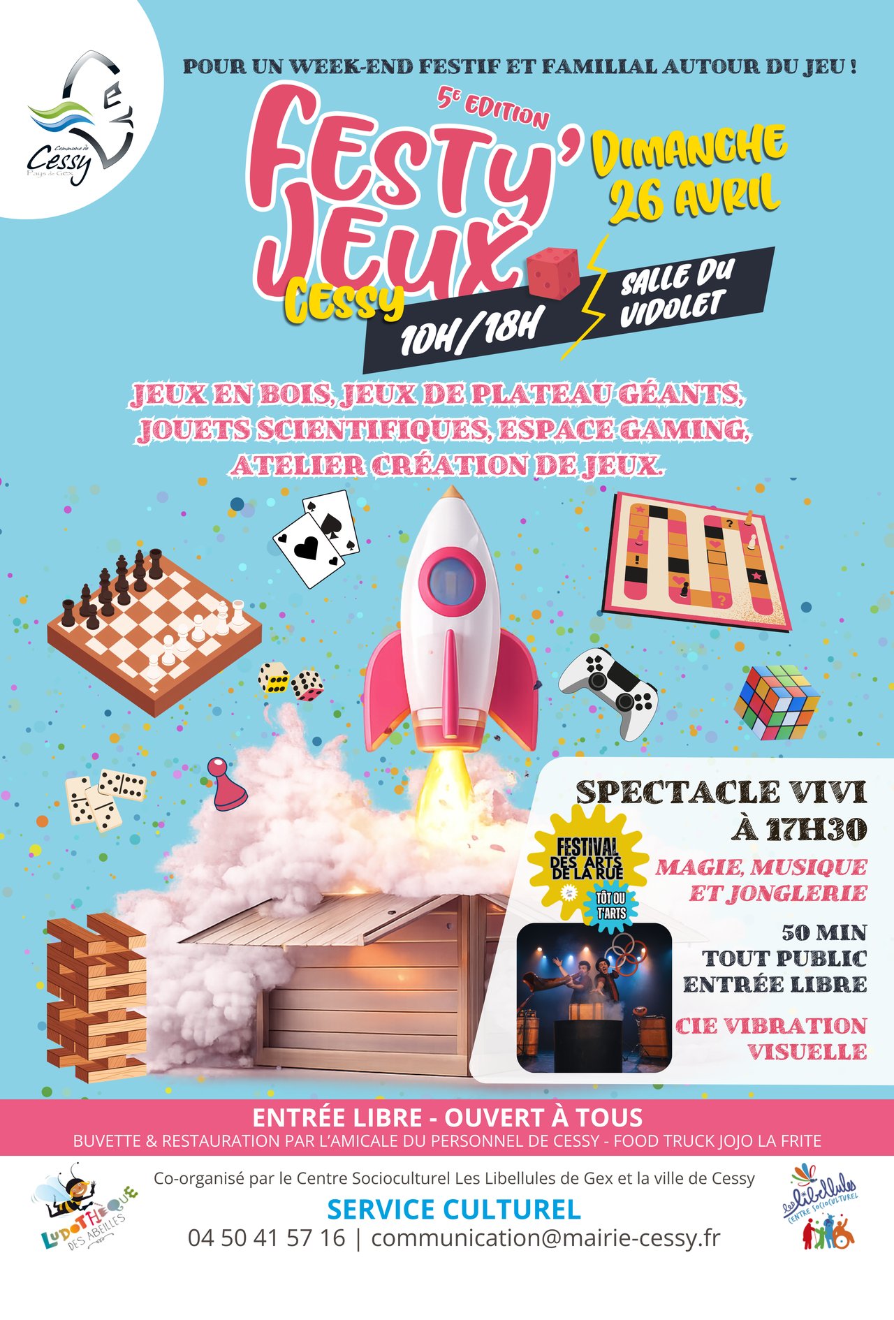 La Ville de Cessy, en partenariat avec le Centre Socioculturel Les Libellules de Gex, vous invite à participer à Festy’Jeux, un week-end convivial dédié au jeu et au spectacle.