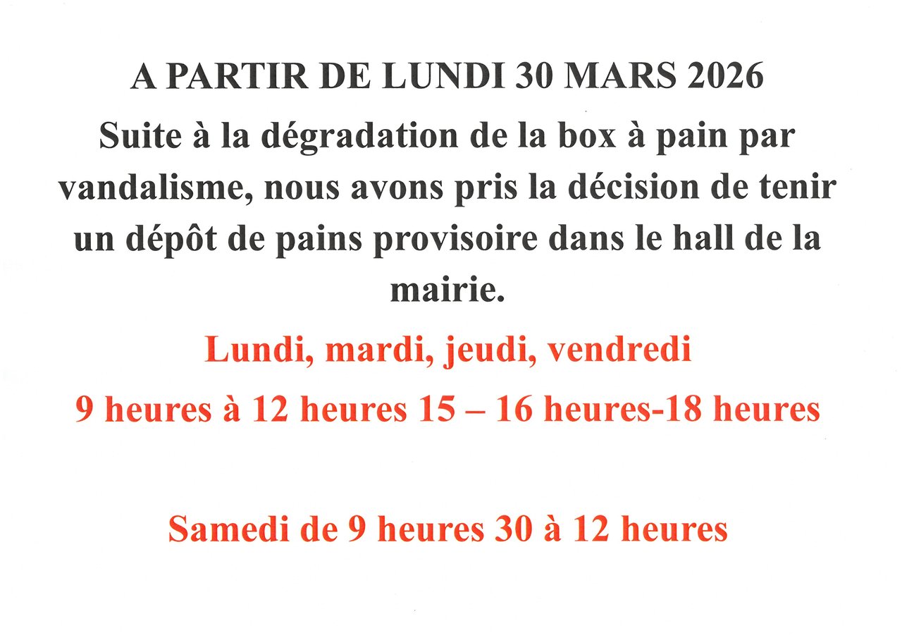 À PARTIR DE LUNDI 30 MARS 2026, UN DÉPÔT DE PAINS SERA INSTALLÉ DANS LE HALL D'ENTRÉE DE LA MAIRIE.
