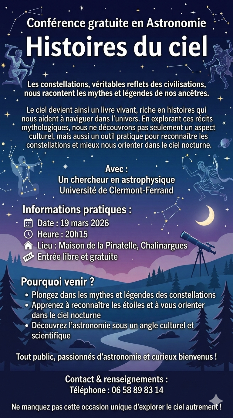 Jeudi 19 mars à 20h15 à la Maison de la Pinatelle à Chalinargues, une conférence sur l'astronomie et la mythologie vous est proposée gratuitement par un astrophysicien de l'université de Clermont Ferrand.