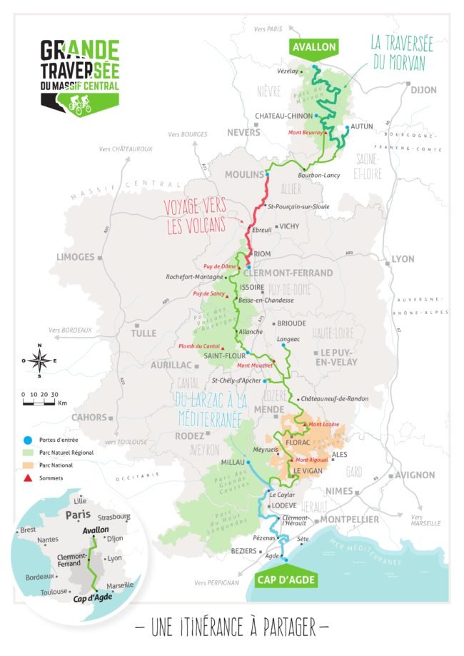 D’une longueur de 666 km, la Grande Traversée du Massif Central à VTT relie Clermont-Ferrand à Sète.