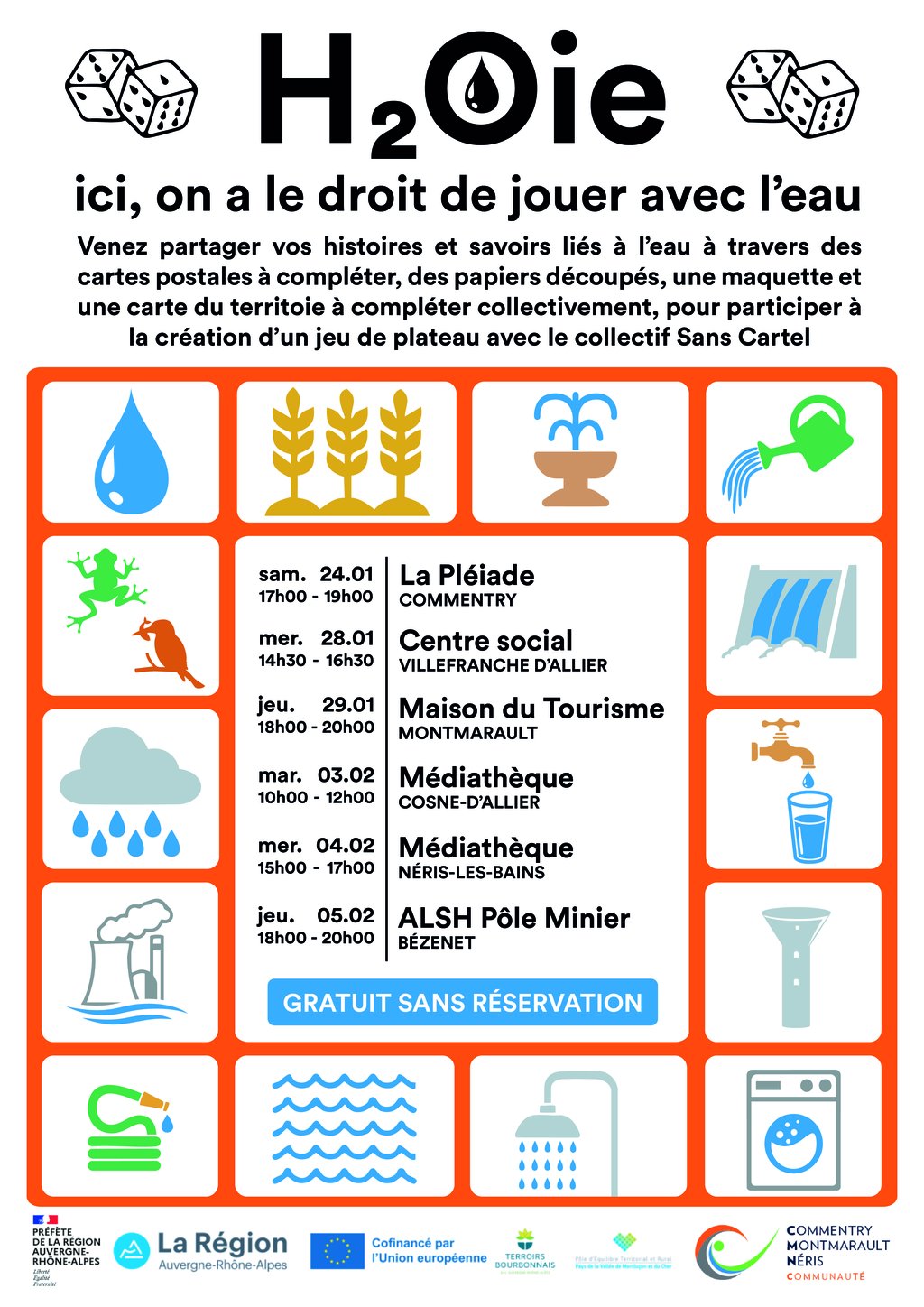 Dans le cadre du projet H2OIE – un jeu de l’oie pour faire couler les savoirs, porté par le collectif Sans Cartel et soutenu par le PETR, plusieurs ateliers participatifs sont proposés sur le territoire de Commentry Montmarault Néris Communauté entre fin janvier et début février.