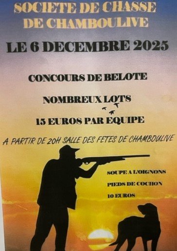 Samedi 6 Décembre à partir de 20 heures, la société de chasse de Chamboulive, organise son concours de belote, à la salle polyvalente.